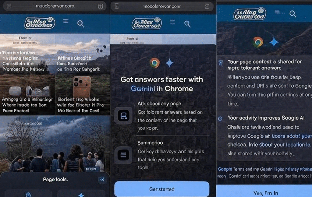 現時点で私のiPhoneではこの機能はまだ利用できませんが、利用可能になると「Get started」バナーが表示され、Geminiの機能を有効化できるとされています。ユーザーは、ブラウザがウェブページのデータをGoogleに送信することを許可するオプトイン設定を行う必要があります。